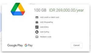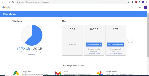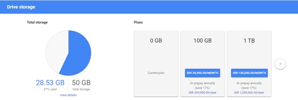 Dilayar akan tampil informasi kapasitas drive email anda. Pilih dan klik “IDR *******/year“ pada tab “Plans”
