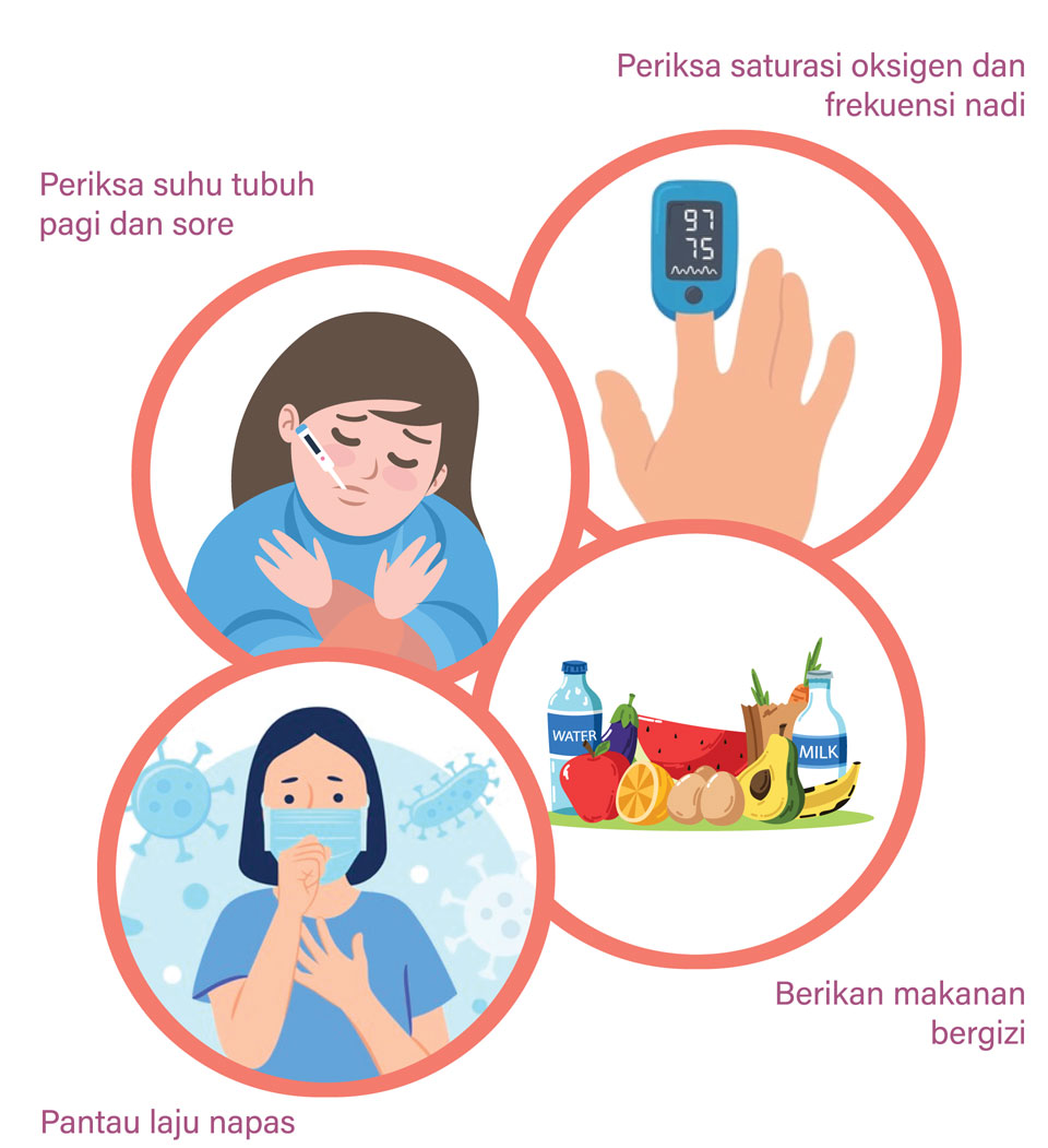 - Periksa suhu tubuh dan saturasi oksigen setiap pagi dan malam